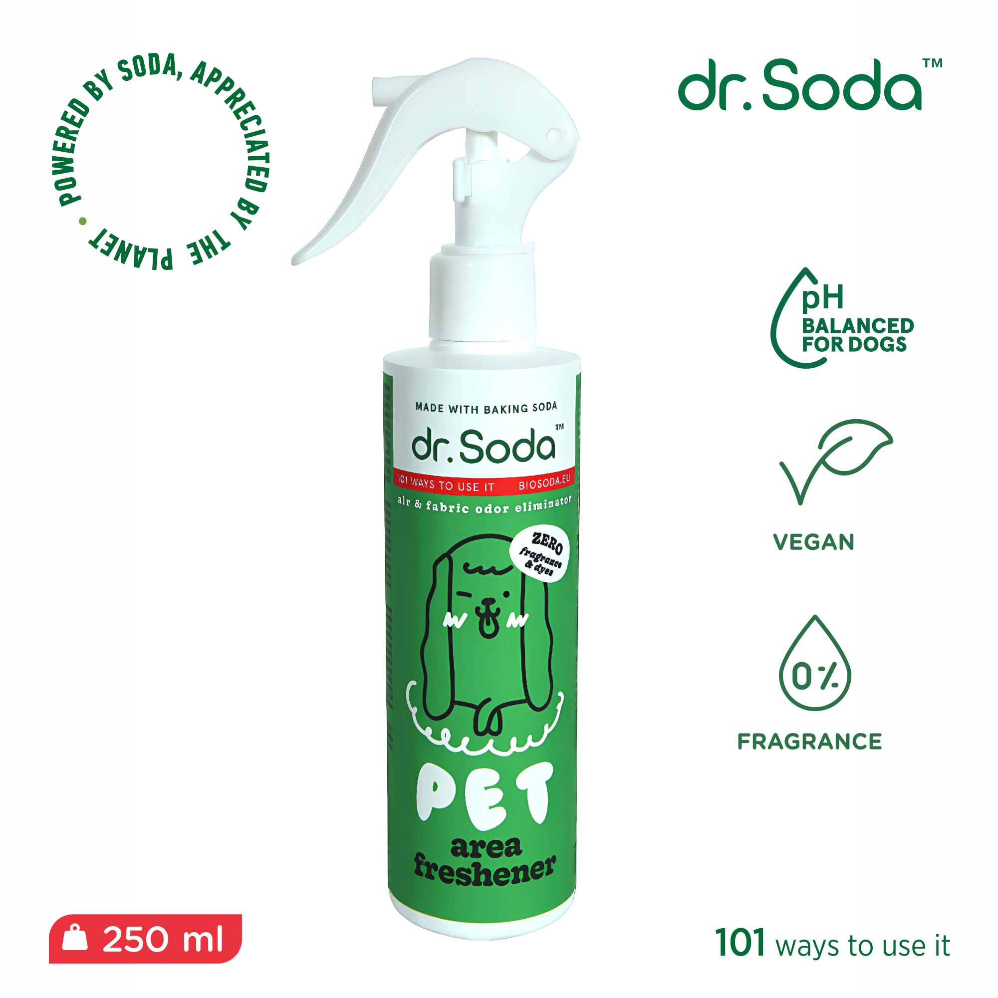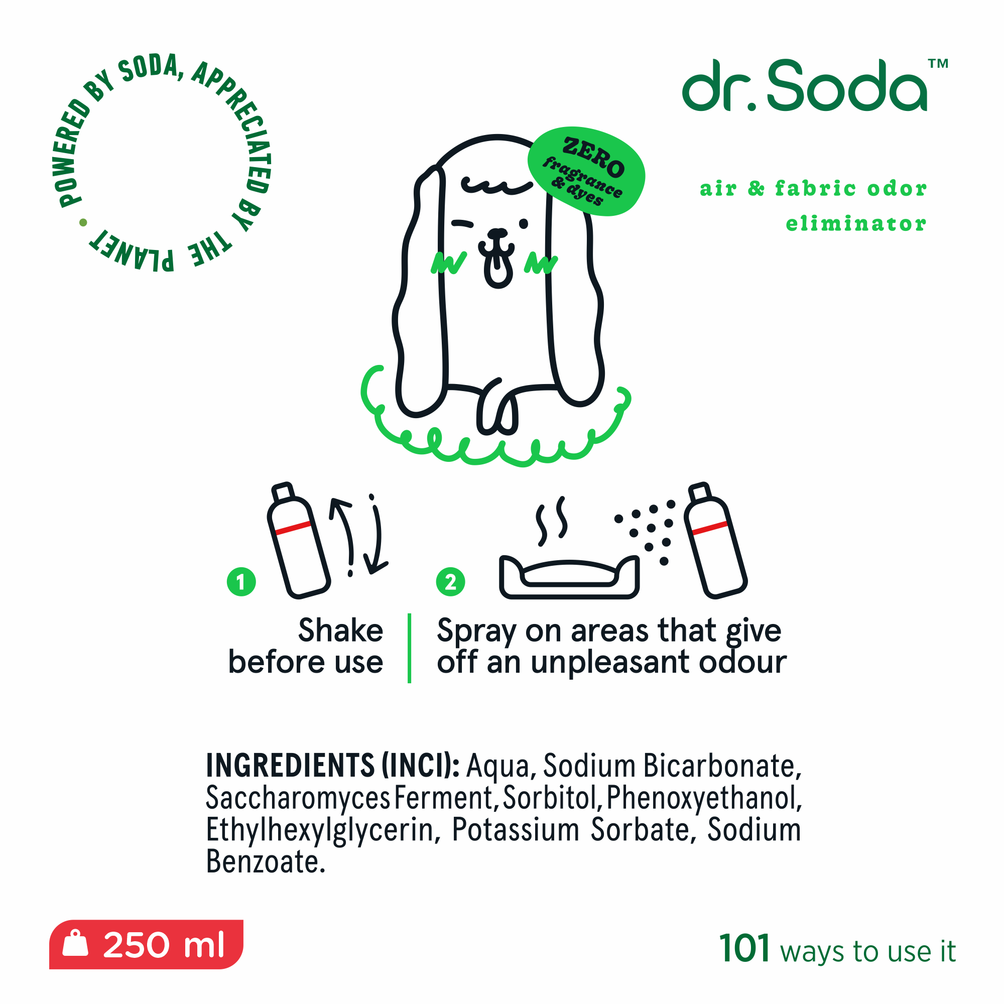 Kvapus eliminuojantis guolių ir kitų augintinių pamėgtų vietų purškalas. Purškalas efektyviai neutralizuoja kvapus iš oro ir audinių dėl sudėtyje esančio pagrindinio komponento sodos.