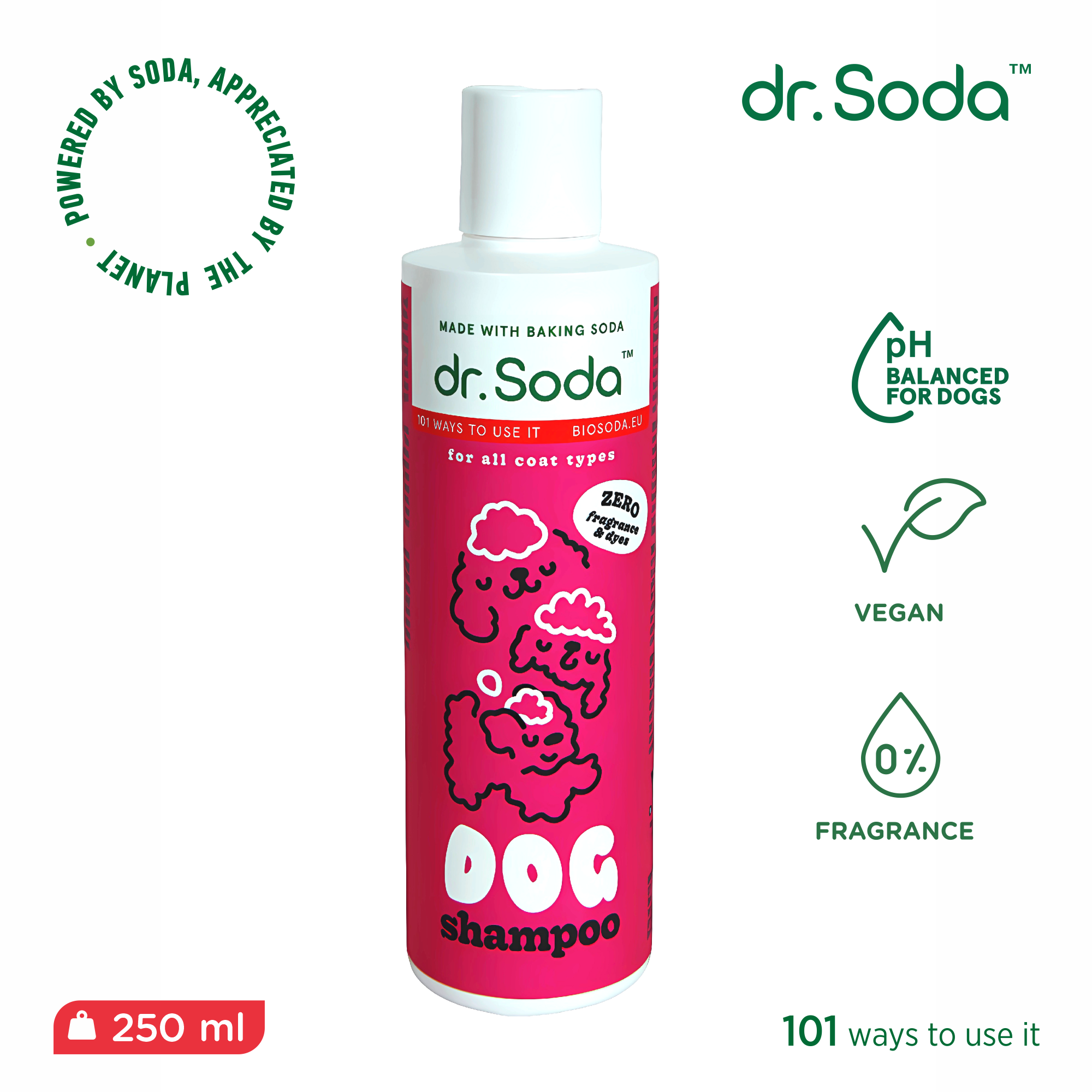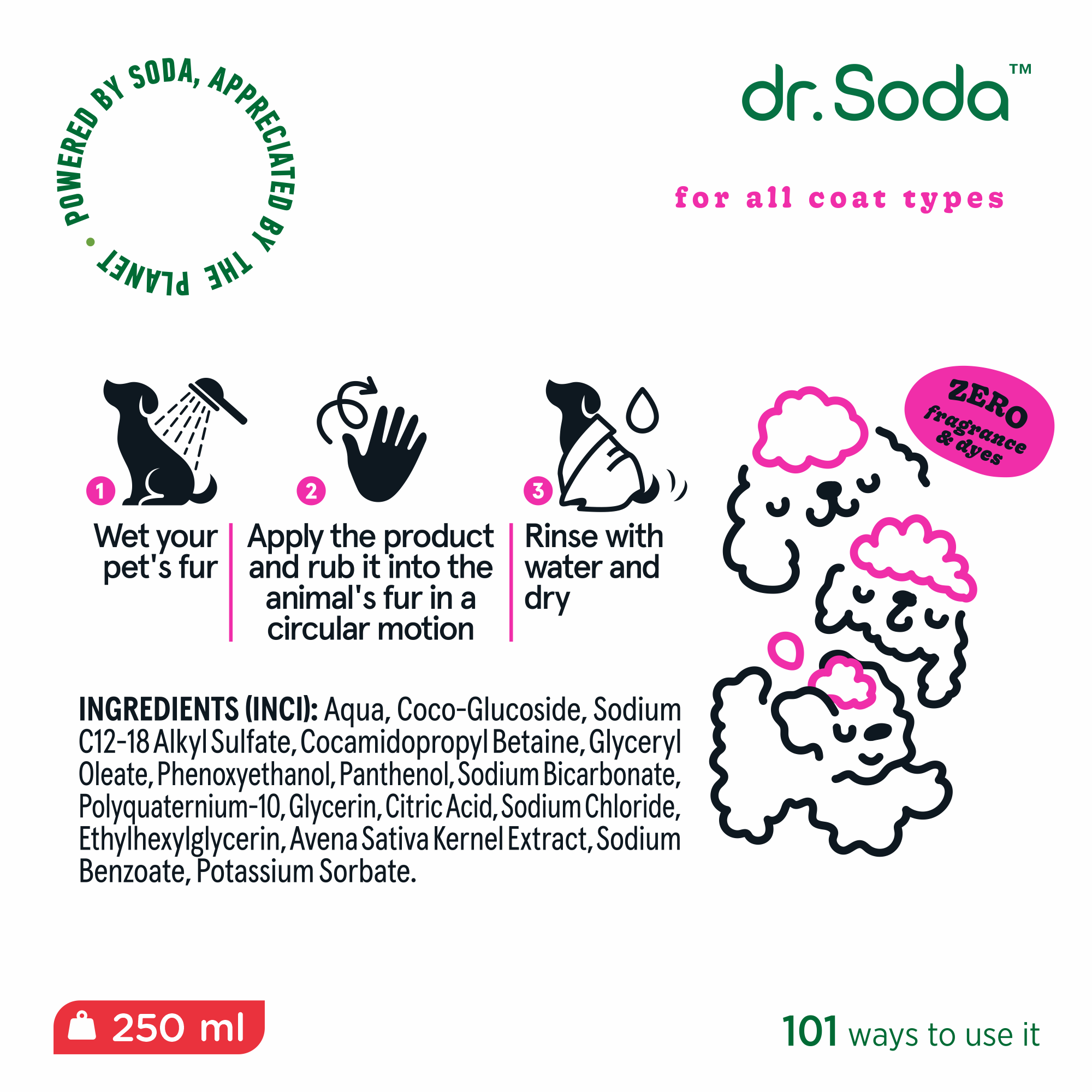 Gelinis šunų šampūnas. Pagrindiniai aktyvieji komponentai – soda, pantenolis ir avižų ekstraktas. Šampūnas švelniai ir efektyviai pašalina nešvarumus ir sudrėkina gyvūno kailį.